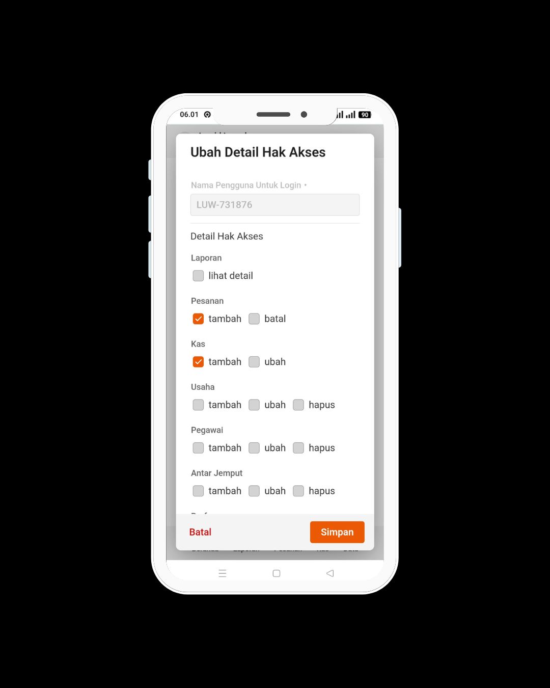Kini Anda bisa mengatur hak akses pegawai, siapa yang boleh tambah, ubah, hapus, atau lihat di dalam aplikasi. Lebih aman dan terkontrol.